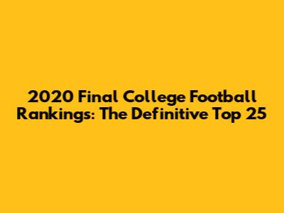 The 2020 college football season was truly unforgettable, marked by challenges, triumphs, and unforgettable moments. The final rankings provide a snapshot of the teams that navigated the season's complexities and emerged as the best in the nation. From the CFP contenders to the rising programs in the top 25, each team contributed to the unique narrative of the year. The resilience and determination of the players, coaches, and fans were on full display, showcasing the passion and spirit of college football. As we look ahead to the future, the lessons and memories of 2020 will serve as a reminder of the enduring power of sport to unite and inspire.